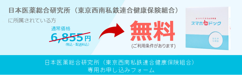 【ご利用条件】 東京西南私鉄連合健康保険組合よりご案内のプログラム参加者が本対象となります。 【ご利用料金】 ---------------------- 自己負担 0円 ---------------------- ※検査方法は最終面談にて、担当者よりご案内いたします。 ※当サービスはご本人様以外はお申込みできません。 ※上記条件以外の方が偽った情報でお申し込みされた場合は、一般販売価格をご請求させて頂く場合があります。 ※お申し込み後のキャンセルはできません。 ※お申し込みから一定期間後、採血済み血液検査キットを返送されない場合、「スマホdeドック事務局」からリマインドメールをお送りいたします。 【重要事項について】 ・お申し込み時に登録された個人情報データおよび検査結果データは、東京西南私鉄連合健康保険組合および本プログラム委託会社に提供されます。 ・提供されたデータは同健康保険組合による保健事業、健康支援に係るサービスの提供、品質向上、企画に利用されます。 ・本重要事項および、上記の利用規約に同意いただけるお客様のみお申し込みいただけます。