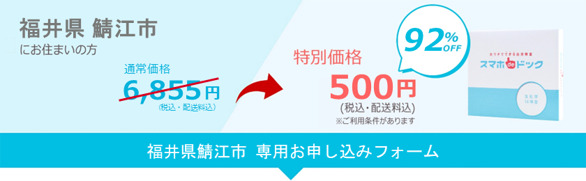 【ご利用条件】 ■受付期間 令和7年11月1日~令和8年1月31日次の全ての条件を満たす方が対象です。 1.令和8年3月31日時点で、満35歳〜満45歳の方(昭和55年4月1日〜平成3年3月31日生まれの方) 2.鯖江市国民健康保険に加入されている方 3.鯖江市国民健康保険人間ドックおよび特定健康診査の未受診の方■ご利用料金 500円 ※先着50名様ご利用条件に該当する方は上記受付期間1回に限り、一般販売価格:「キット代金6,578円(税込)+別途送料」のところ、上記金額で検査をお受けいただけます。※当サービスは、ご本人様以外はお申し込みできません。※上記条件外の方が、偽った情報にてお申し込みされた場合は、費用全額をご請求させていただく場合がございます。※お申し込み後は検査キットが届きますので、必ず検査を実施してください。実施いただけない場合、費用全額をご請求させていただく場合がございます。※お申し込み後のキャンセルはできません。