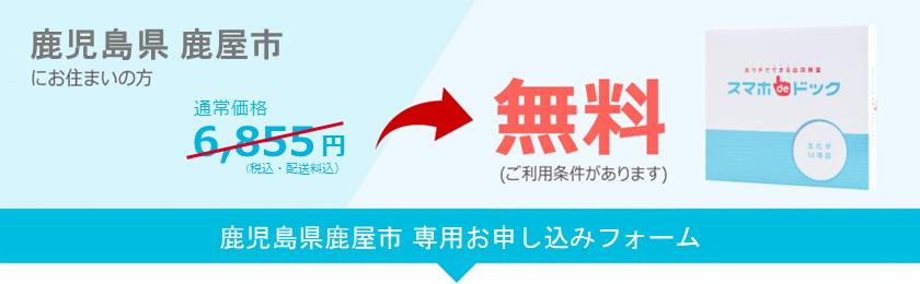 【ご利用条件】 ■受付期間 令和8年1月15日~令和8年2月15日 次の全ての条件を満たす方が対象です。 1.令和8年3月31日時点で、満40歳〜満59歳の方 2.令和7年度特定健診未受診の方 3.鹿屋市国民健康保険に加入されている方 ■ご利用料金 無料 ※先着50名様 ご利用条件に該当する方は上記受付期間1回に限り、一般販売価格:「キット代金6,578円(税込)+別途送料」のところ、無料で検査をお受けいただけます。 ※当サービスは、ご本人様以外はお申し込みできません。 ※上記条件外の方が、偽った情報にてお申し込みされた場合は、費用全額をご請求させていただく場合がございます。 ※お申し込み後は検査キットが届きますので、必ず検査を実施してください。実施いただけない場合、費用全額をご請求させていただく場合がございます。 ※お申し込み後のキャンセルはできません。 ※既に国民健康保険を喪失された方にもお送りしている場合がございます。ご容赦ください。 【オンライン受診相談のご案内】 今年度の鹿屋市(特定健診)スマホdeドックでは検査結果がCまたはD判定の方を対象にオンライン受診相談をご提供いたします。 対象の方には検査完了後にメールでご案内いたしますので、お早めにスマホdeドックのお申し込みと検査の実施をお願いいたします。 ご案内は2月上旬以降を予定しております。(以後適宜ご案内します) ・医師がビデオ通話で検査結果の説明と治療の必要性について解説 ・先着7名様限定(無料) ※オンライン受診相談はファストドクター株式会社が提携する医療機関(医療法人社団新拓会)の医師が対応いたします。 ※スマホdeドックの検査結果はファストドクター株式会社および提携医療機関(医療法人社団新拓会)に提供されるものとし、これについて同意の上でお申し込みをお願いいたします。 ※提供されたデータは、オンライン受診相談及び診察時の参考情報として利用されます。